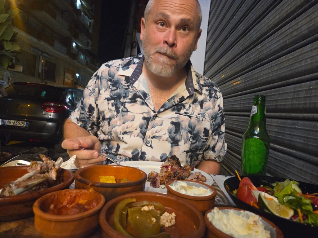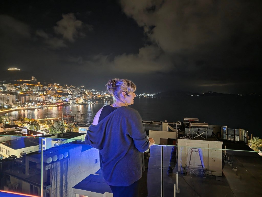 I told y’all that we found the expat bar and that’s been so helpful for us. The owners are such kind and lovely people and that luckily doesn’t stop them from also being a riot to hang out with. We’ve made connections with folks that are friendly, nice to chat when we’re in the same place but that’s about it. We’ve made real friends with people that we get to spend extra time with; painting, eating, drinking, connecting. It’s been so great. One couple invited us to go to their friend’s surprise birthday party in Sarande, a town a few hours south of here that happens to be our next stop on our slow travel journey. They figured out all the details, we basically just showed up with an embarrassingly wrapped bottle of wine to give the birthday boy (seriously, I wish we had a picture) and some trust in the process.